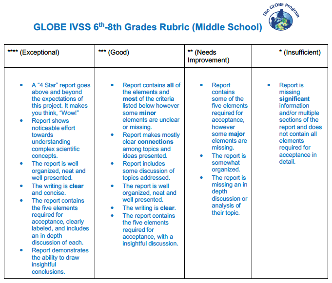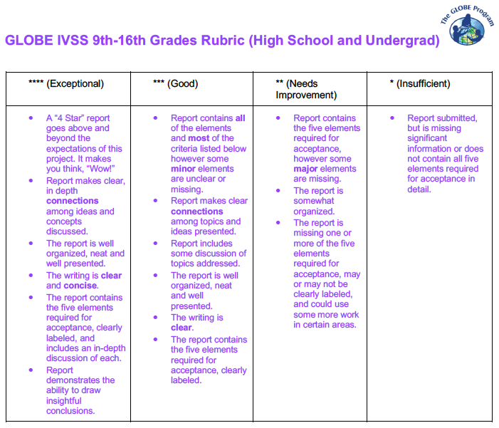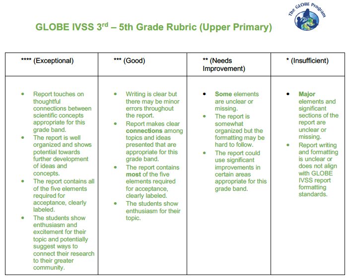 - Data collection: A description of GLOBE protocols used to answer the research question as well as where and how data was gathered in the field (sampling method: Where, how many samples were measured)